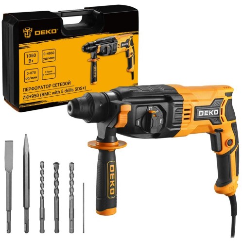 Перфоратор сетевой Deko ZKH950 в кейсе с набором из 5 буров SDS+, 1050 Вт 083-1005